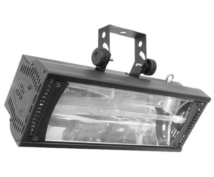 The Xeno 2500 is an ultra-high frequency strobe luminaire powered by a 2,500-watt Xenon lamp. When multiple products are linked, built-in automated programs trigger several pre-programmed shows via master/slave. The product is controlled by sound-activation or DMX through 3- and 5-pin connectors.